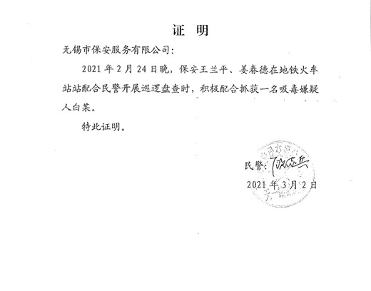 2月24日,公司保安队员王兰平、姜春德在巡逻盘查时协助地铁天一站民警抓获一名吸毒嫌疑人员,两人在行动中反应迅速、处置合理,得到了公安机关的充分肯定。