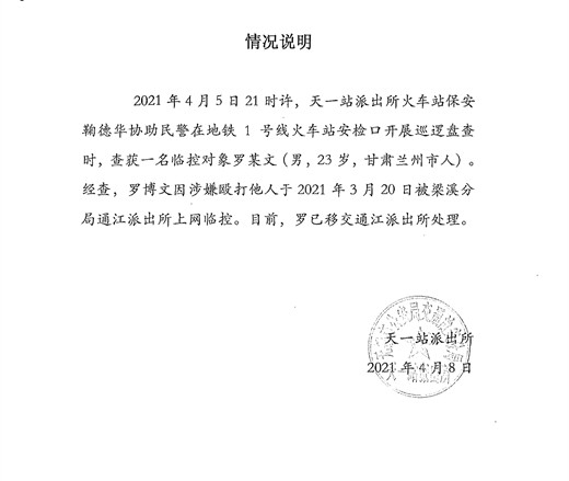 4月5日21时,公司派驻天一派出所火车站保安队员鞠德华协助民警在站内巡逻时,查获一名网上临控对象,目前该男子已移交通江派出所处理。保安队员工作认真负责,主动积极协助民警维护站区安全稳定,受到了一致赞扬。
