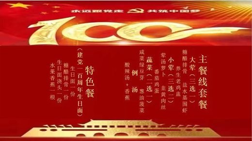为庆祝中国共产党成立100周年,进一步展现党的丰功伟绩和公司企业文化,7月1日,公司食堂精心布置,推出特色套餐,与全体员工分享党百岁生日的喜悦与甜蜜,共同祝福伟大的党带领中国人民迈进新征程、奋进新时代。