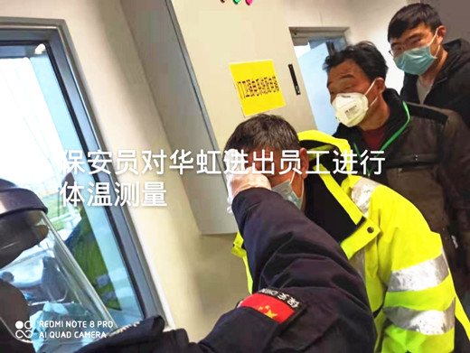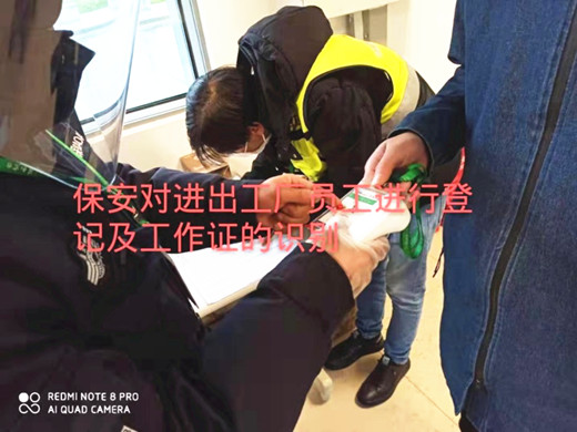 华虹中队疫情期间不停产,保安积极配合进行厂区人员管控,落实人员识别检测工作,确保安全第一。