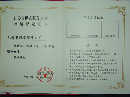 在全省保安服务公司首次等级评定工作中,经过省保安协会等有关部门的严格评审,公司被评定为“江苏省一级保安服务公司”。公司将以此为契机,不忘初心,再接再厉,紧紧围绕“抓基层、打基础、树形象、谋发展”的工作思路,奋力开创公司发展新局面。