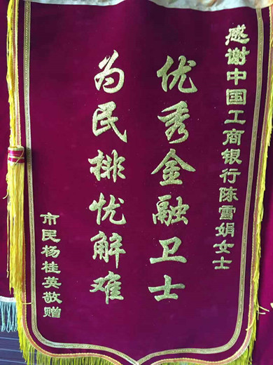 10月15日上午10时,公司派驻工商银行梁溪支行保安员陈雪娟在大厅捡到钱包一个,内有身份证银行卡若干,陈雪娟马上联系银行工作人员积极寻找失主,后多方联系终于找到失主杨桂英。当失主拿到失而复得的钱包时,激动万分地表示卡内有300多万存款,为感谢保安队员陈雪娟拾金不昧的高尚精神,特送锦旗一面,以表谢意。
