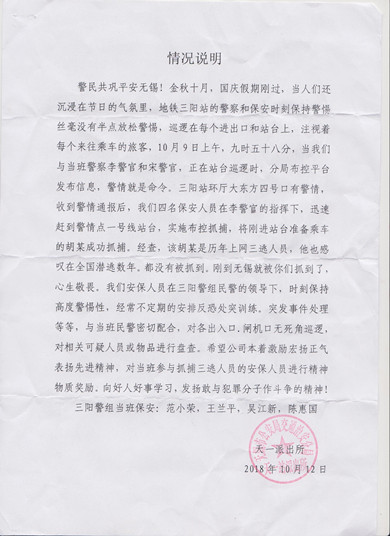日,公司派驻地铁三阳站保安员范小荣、王兰平、吴新江、陈惠国协助民警在一号线站台实时布控抓捕,抓获网上三逃人员胡某。