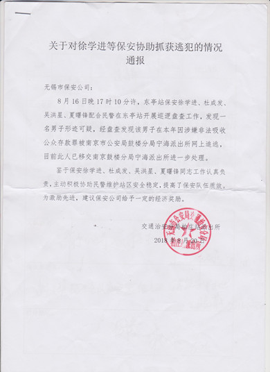 8月16日,公司派驻地铁东亭站保安徐学进、杜成发、吴洪星、夏曙锋配合民警开展巡逻盘查过程中,发现一名形迹可疑男子,盘查后发现是一名网上追逃对象,现此人已移交南京警方进一步处理。徐学进、杜成发、吴洪星、夏曙锋四名同志工作认真负责,主动积极协助民警维护站区安全稳定受到了一致赞扬。