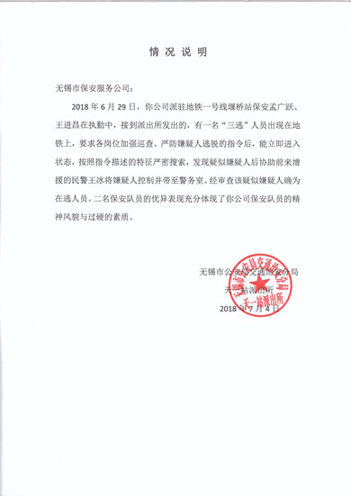 6月29日,天气异常闷热,我公司派驻地铁一号线堰桥站保安队员孟广跃、王进昌在执勤中,接到公安机关通报,有一名“三逃”人员可能乘坐地铁,要求各岗位加强执勤,严防嫌疑人逃脱的指令。军人出身的孟广跃带领王进昌立即进入状态,按照指令描述的特征严密搜索,19时18分,孟广跃在地铁堰桥站南出口发现疑似嫌疑人,他与王进昌马上汇报情况,迅速靠近嫌疑人并将其控制,与前来增援的民警王冰把嫌疑人带到警务室,经审查确认其为在逃人员。