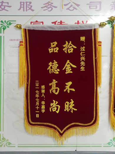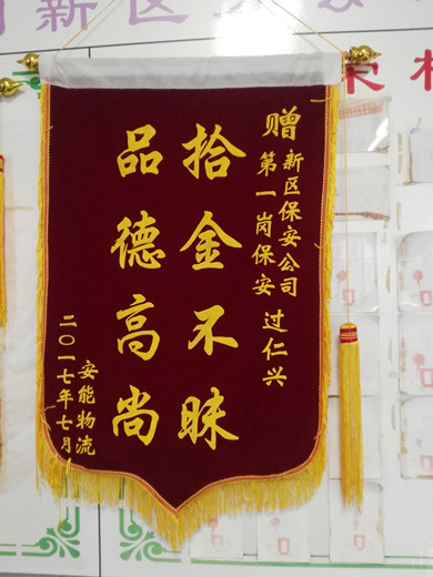 近期,新区分公司派驻地铁三号线新区第一岗保安队员拾金不昧受到了多位市民和单位的赞扬。7月6日,保安队员过仁兴在执勤时捡到苹果平板电脑一部,在烈日下苦苦守候失主,最终物归原主,失主华先生连连感谢特地送上锦旗赞扬队员的高尚品德。7月19日,保安队员王标、王建华、过仁兴等人发现路过的卡车撒落的几箱货物,后经证实价值上万元,几名队员立即上报,通过不懈努力最终寻找到遗失货物的单位——无锡安能物流有限公司。该公司特此送来了锦旗,对保安队员们拾金不昧的高尚情操以此表示感谢。