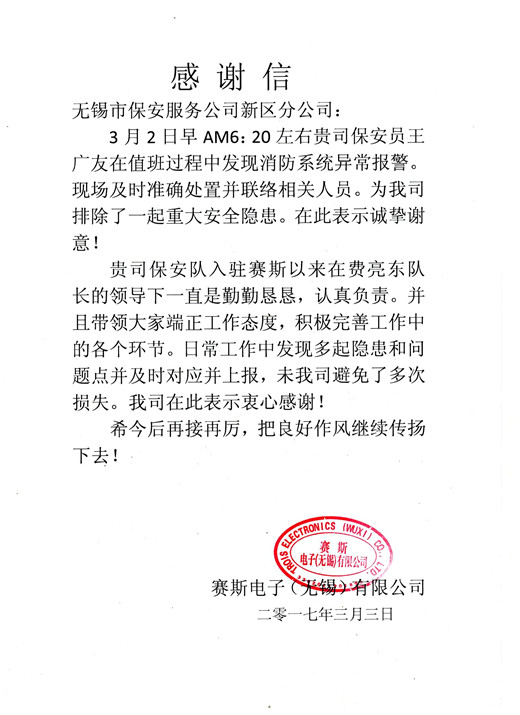 3月2日,新区分公司派驻赛斯电子(无锡)有限公司保安队员王广友在值班巡查过程中发现消防系统有异常报警现象,查验显示消防设备压力异常已至极限。王广友及时处置,规范操作,避免了整个厂区消防喷淋系统启动对整个厂区车间及库房的财产造成重大损失。客户单位特地发来表扬信赞扬保安队员认真履职的敬业精神。