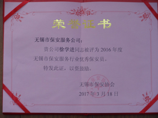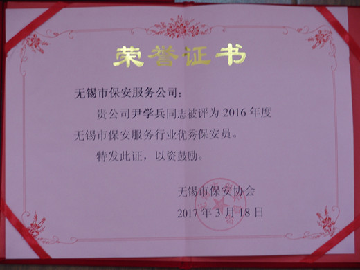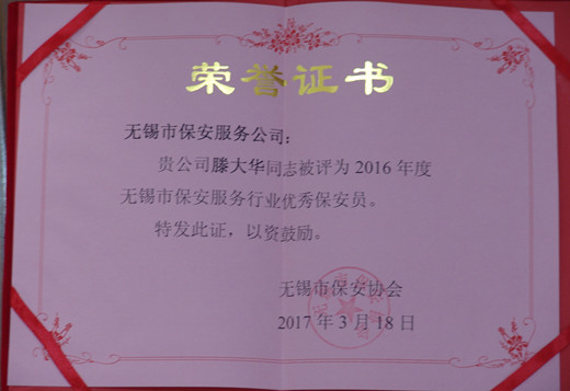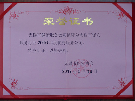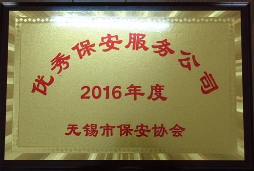 2016年公司始终坚持“安全第一、优质服务、遵守合同、信誉至上”的服务宗旨,以维护社会治安、保障客户安全为已任,强化内部管理,提升服务质量,实现了社会效益和经济效益的双丰收,为“平安无锡”建设作出了应有贡献,由于工作突出,被无锡市保安协会评为“2016年度优秀保安服务公司”,滕大华、尹学兵、徐学进3名保安队员被评为“2016年度无锡市保安服务行业优秀保安员”。