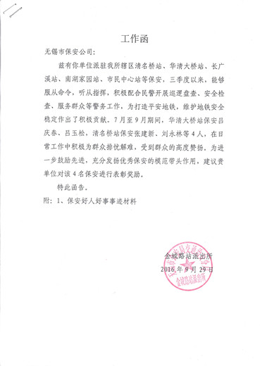 近期,市公安局交通治安分局金城路站派出所致函表扬公司派驻地铁清名桥站、华清大桥站、长广溪站、南湖家园站、市民中心站保安队员工作扎实认真,服从命令、听从指挥,积极配合民警开展各项工作,在维护地铁安全稳定作出了积极贡献。其中吕庆春、吕玉松、张建新、刘永林四名同志在工作中积极为群众排忧解难,受到高度赞扬,充分发挥了模范带头作用。
