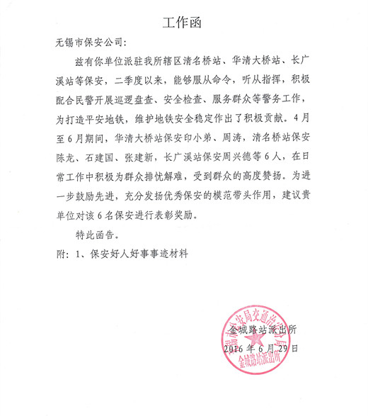 近期,市公安局交通治安分局金城路站派出所致函表扬公司派驻地铁清名桥站、华清大桥站、长广溪站六名保安队员印小弟、周涛、陈龙、石建国、张建新、周兴德同志工作扎实认真,服从命令、听从指挥,积极配合民警开展各项工作,在维护地铁安全稳定作出了积极贡献。