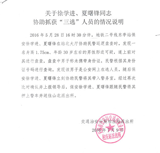 今年5月,公司派驻地铁二号线东亭站保安队员徐学进、夏曙锋协助民警巡逻盘查时,发现一名可疑男性,对其进行盘查,后发现该男子为公安网上在逃人员,随后保安队员立刻协助民警将其带入警务室,并将其押上警车并送往山北派出所。
