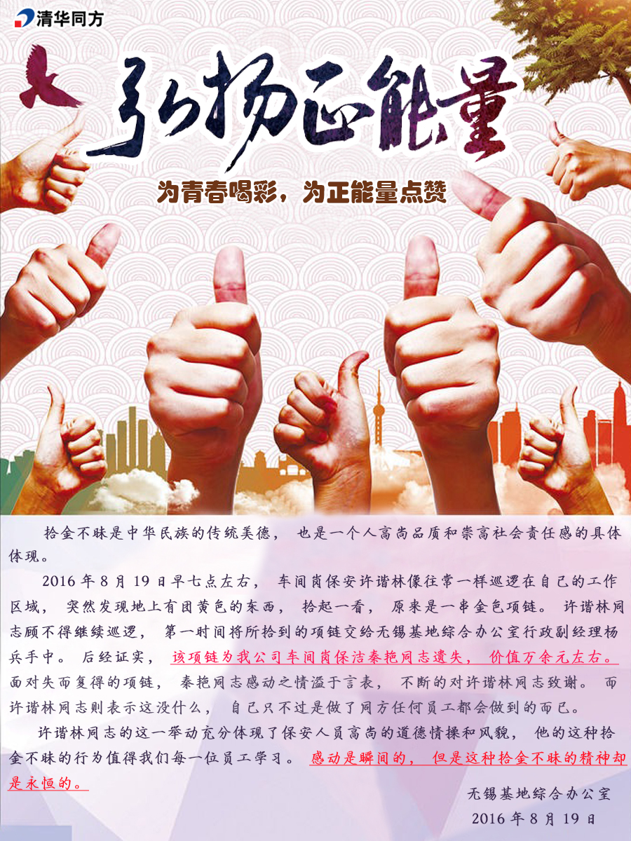 8月19日上午,新区分公司派驻同方创新科技园有限公司保安队员许谐林巡逻时拾到一串金色项链,第一时间将项链交给了客户单位领导,后经证实,该项链价值在万余元左右。面对失而复得的项链,失主感动之情溢于言表,不断的对许谐林致谢,而许谐林则连连表示是自己应做的,他的这一高尚道德情操和风貌举动,受到了客户单位的通报表扬。