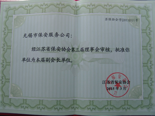 3月17日,江苏省保安协会在南京召开会员代表大会,表彰2014年度全省优秀保安服务公司和优秀保安员,选举产生了第三届理事会及常务理事会。经各市保安协会逐级推荐、层层评审,我公司被江苏省保安协会授予“2014年度全省优秀保安服务公司”、“江苏省保安协会副会长单位”、“江苏省保安协会理事单位”。